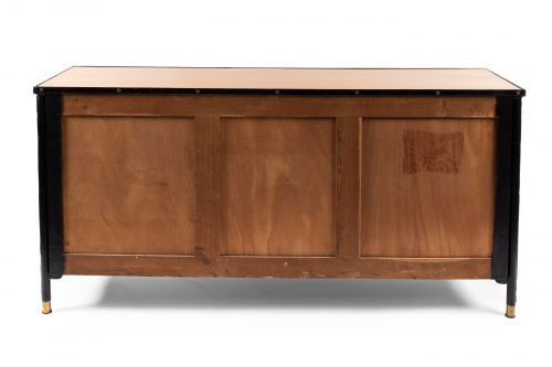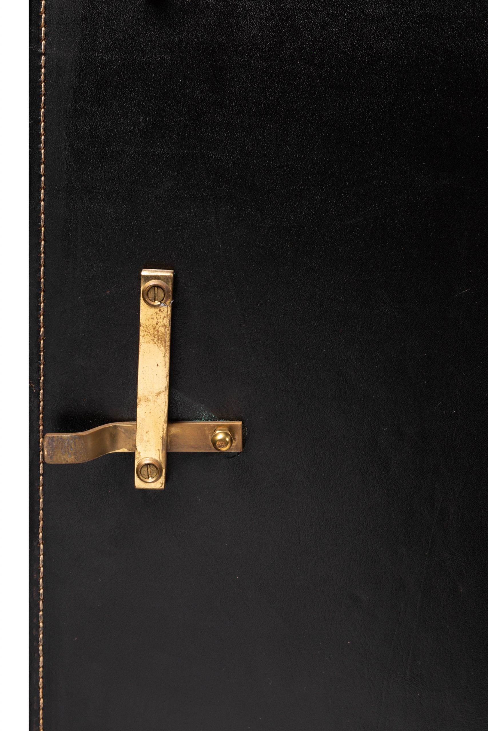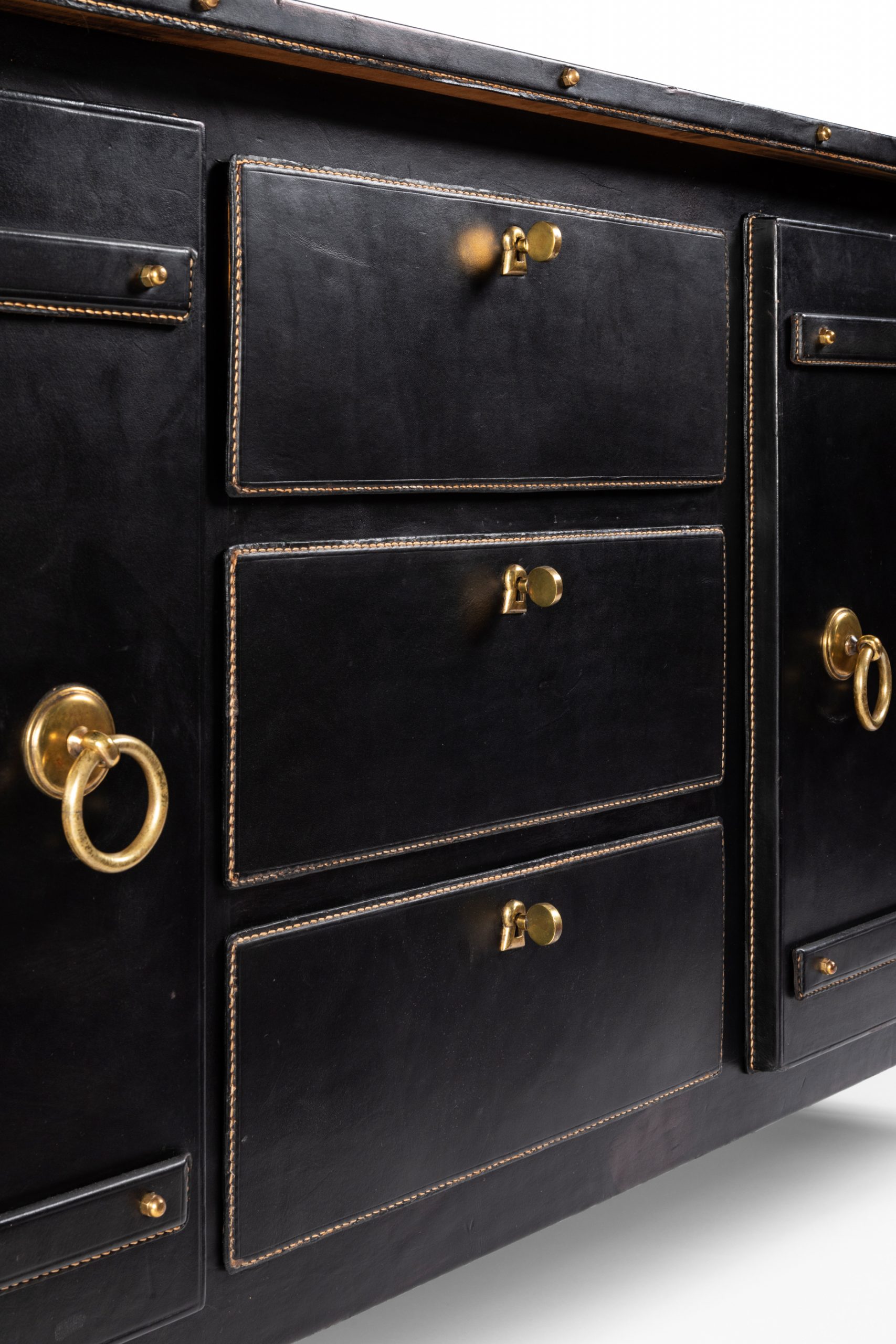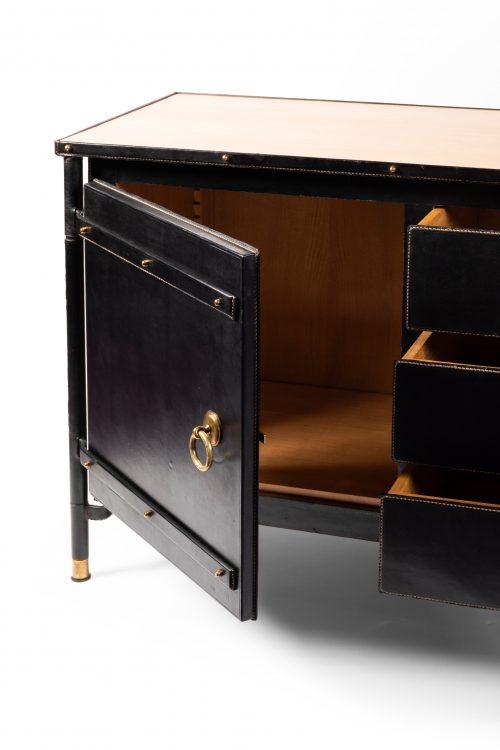 Sideboard – SOLDJacques ADNET Sideboard in black hand stitched leather decorated with brass details. L. 182cm H. 87cm W.49cm