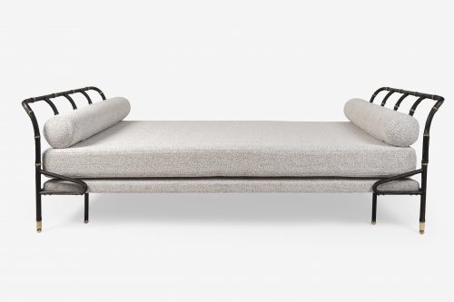Daybed gainé de cuir noir piqué sellier et décoré de bagues en laiton doré.