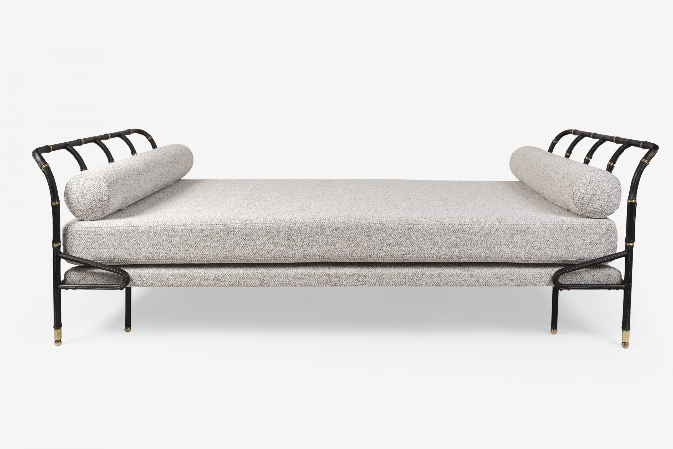 Jacques ADNETDaybed gainé de cuir noir piqué sellier et décoré de bagues en laiton doré.