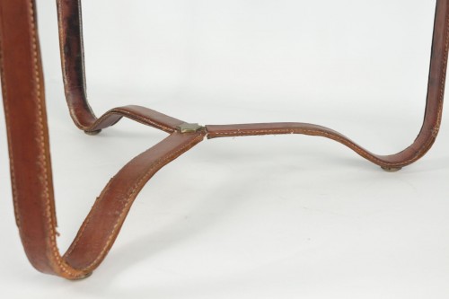 Jacques ADNETExceptionnel guéridon tripode à structure en métal gainé de cuir piqué sellier havane.