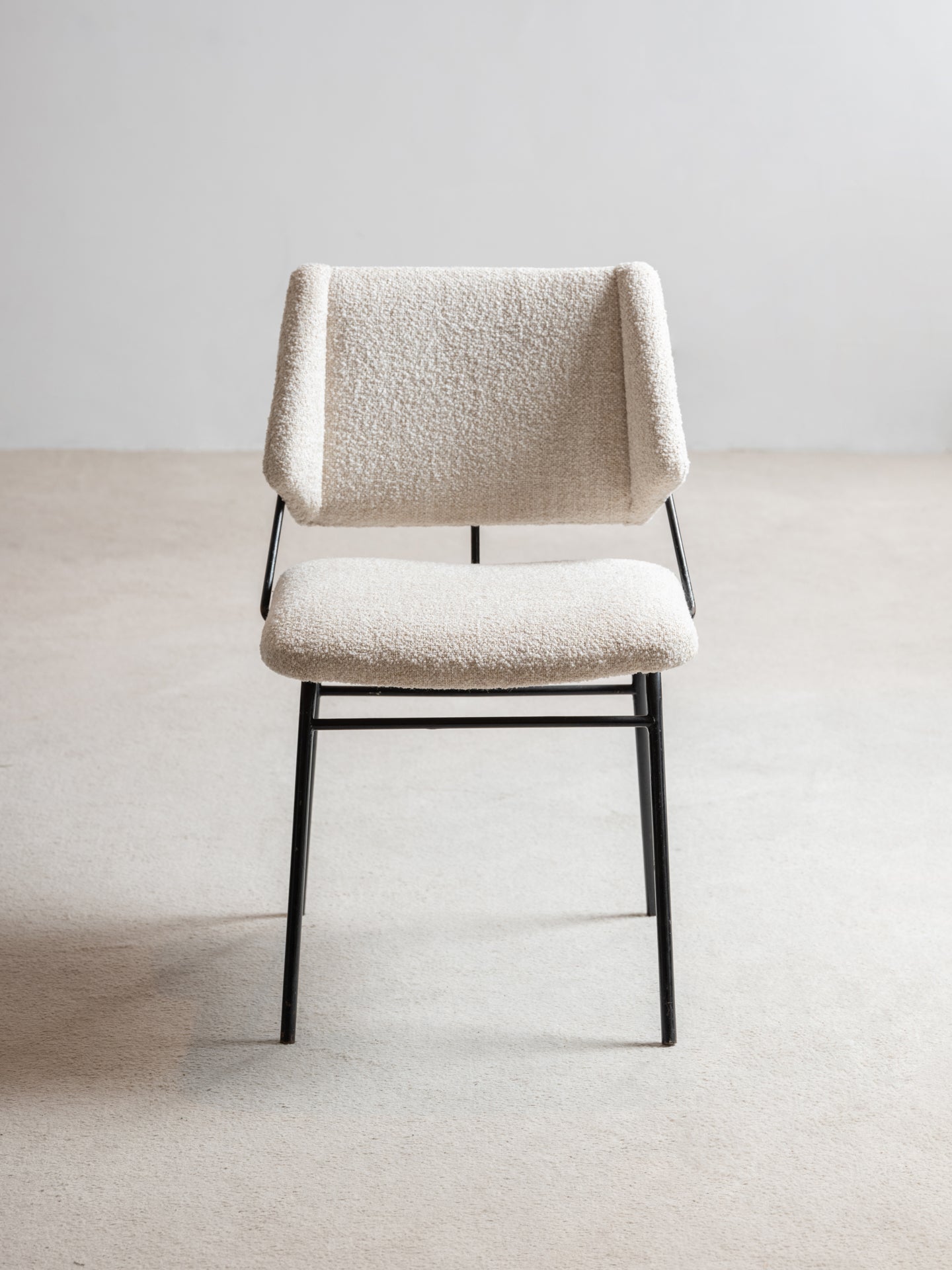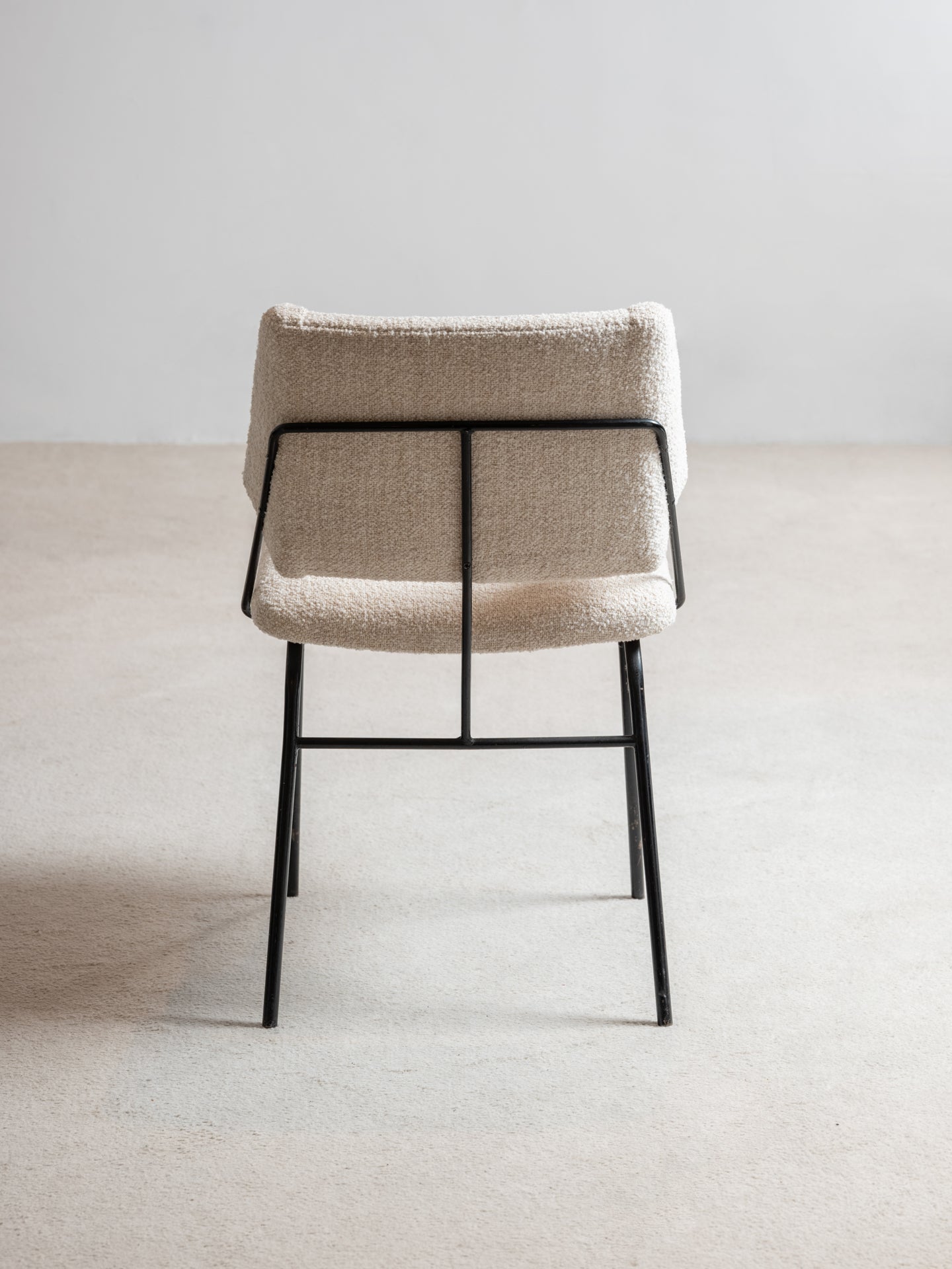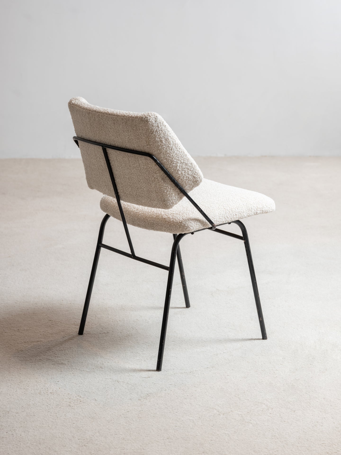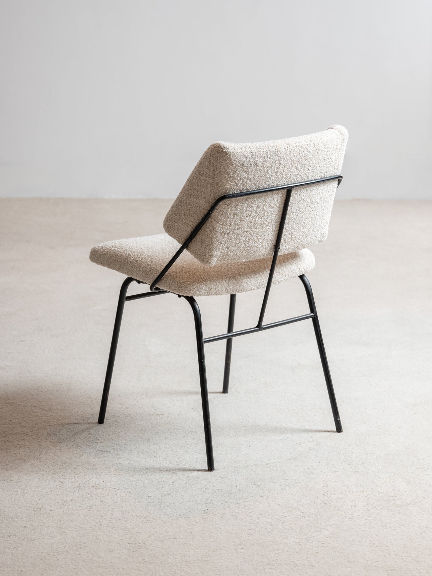 Armchair with black metal frame. Seat and backrest covered in grey fabric.