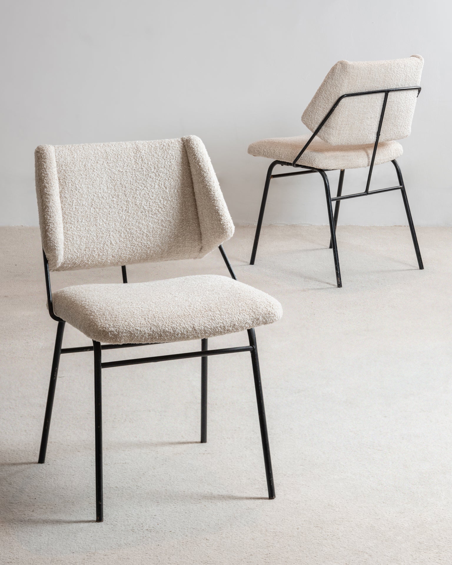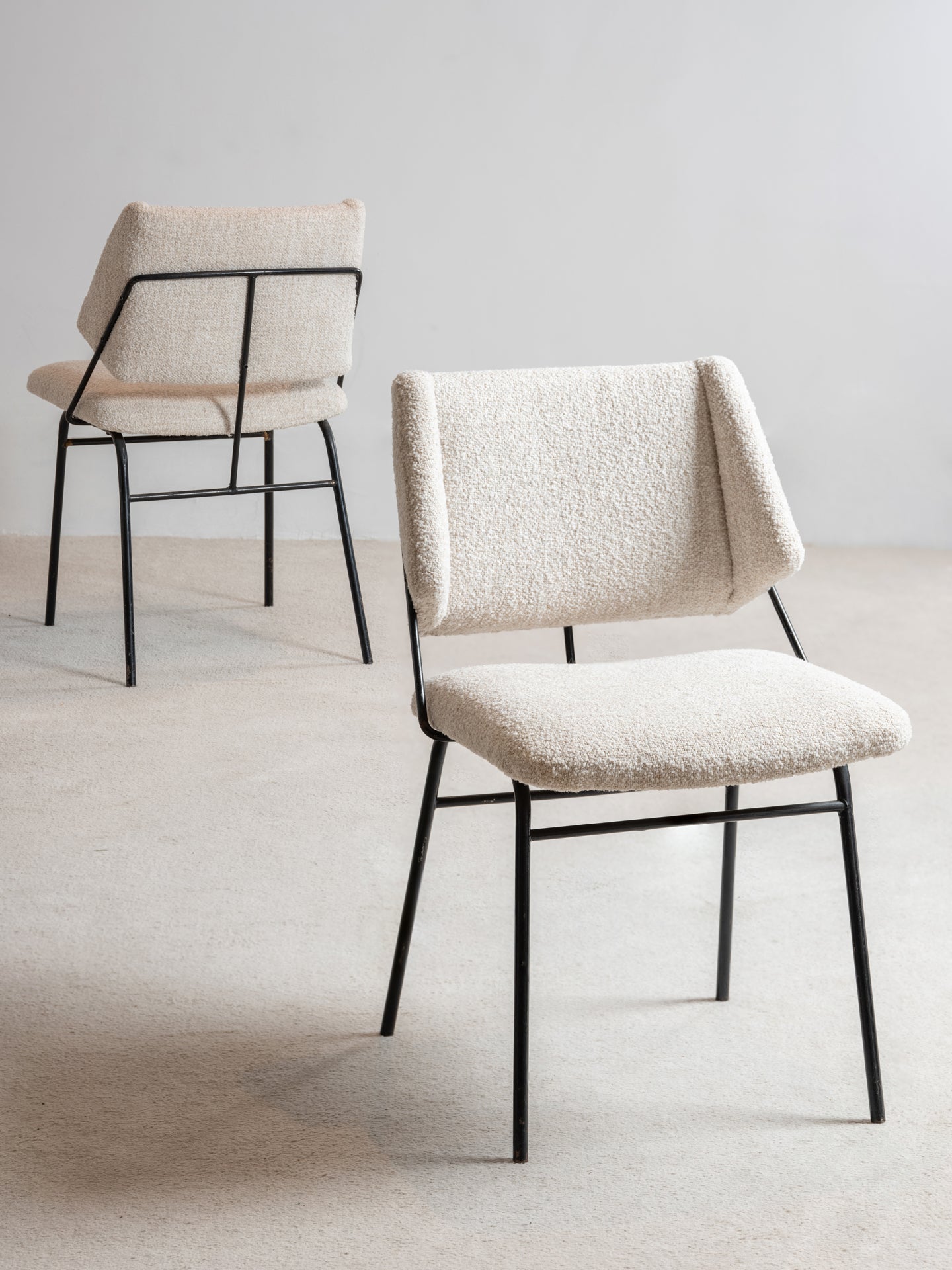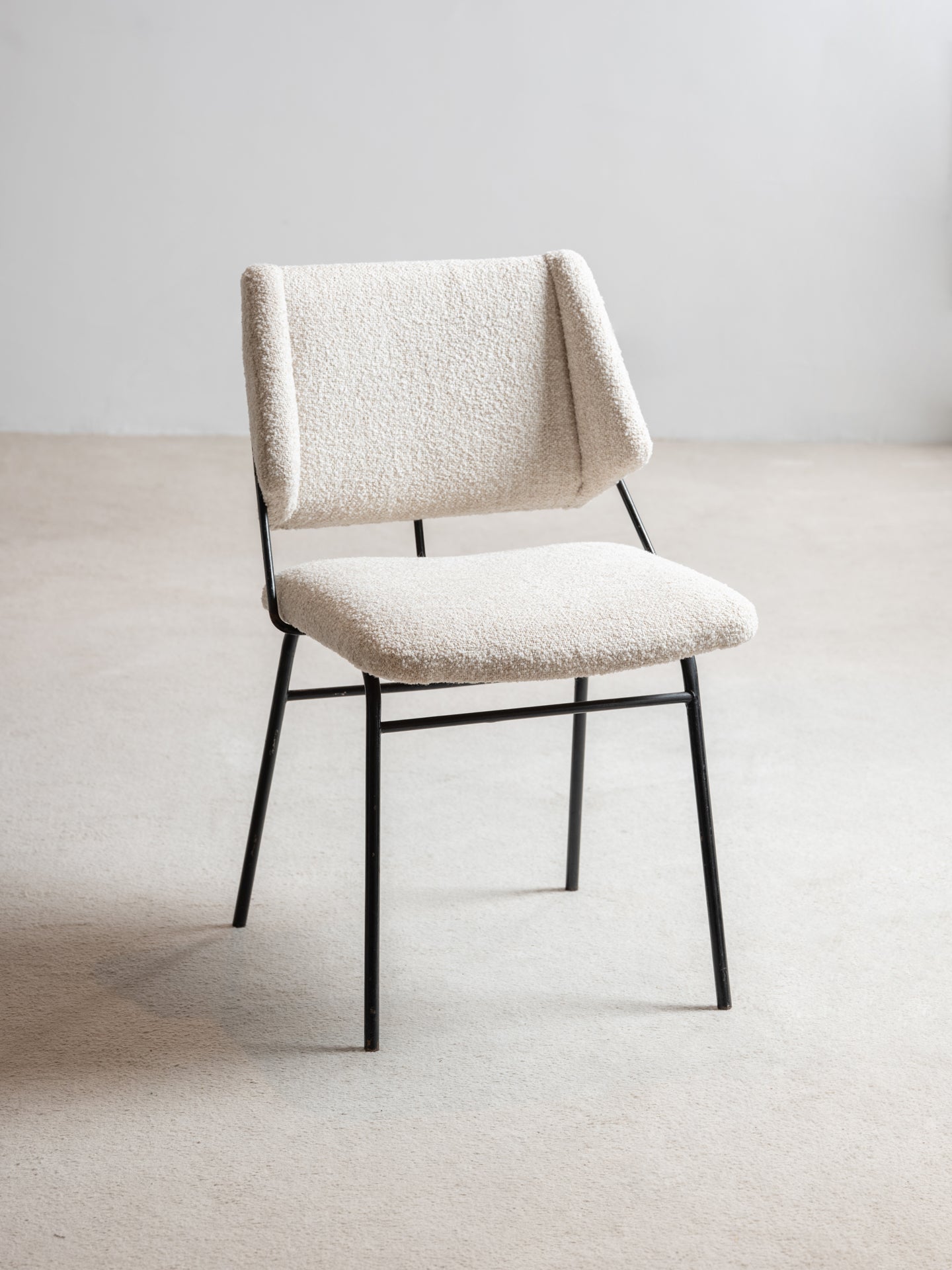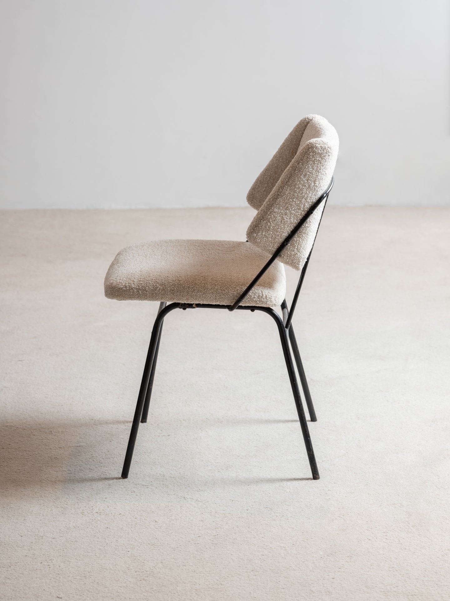 Armchair with black metal frame. Seat and backrest covered in grey fabric.