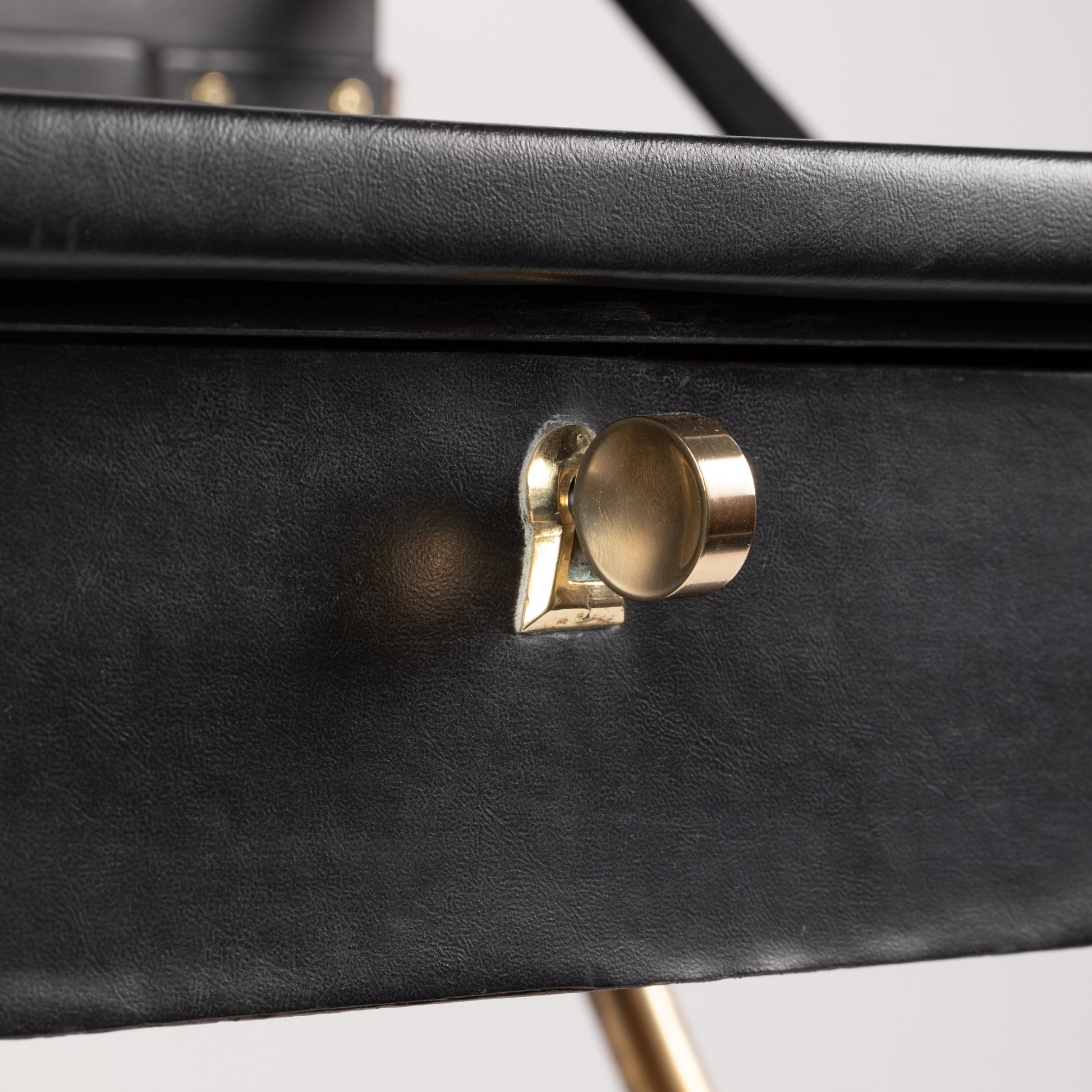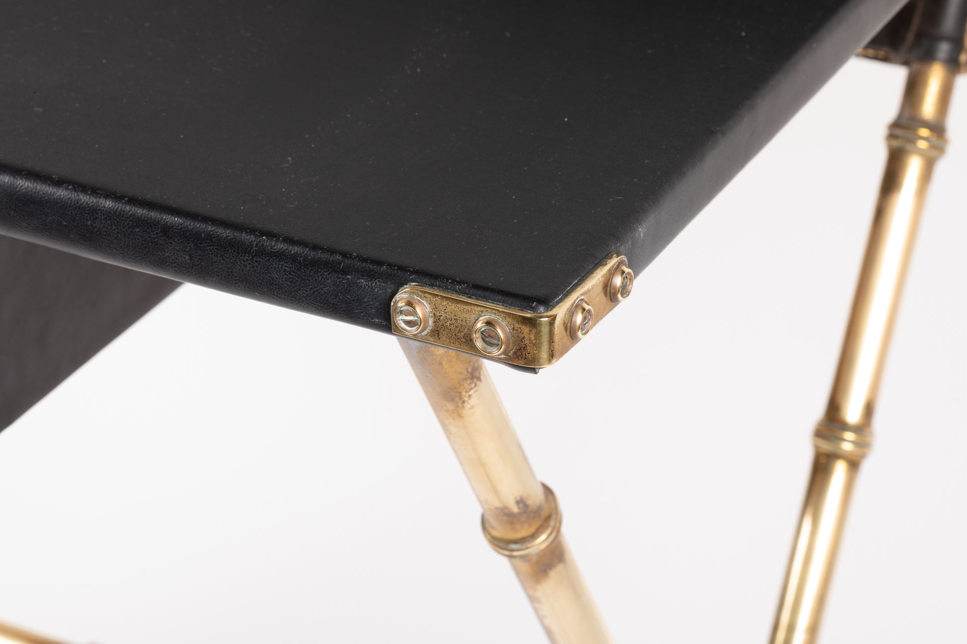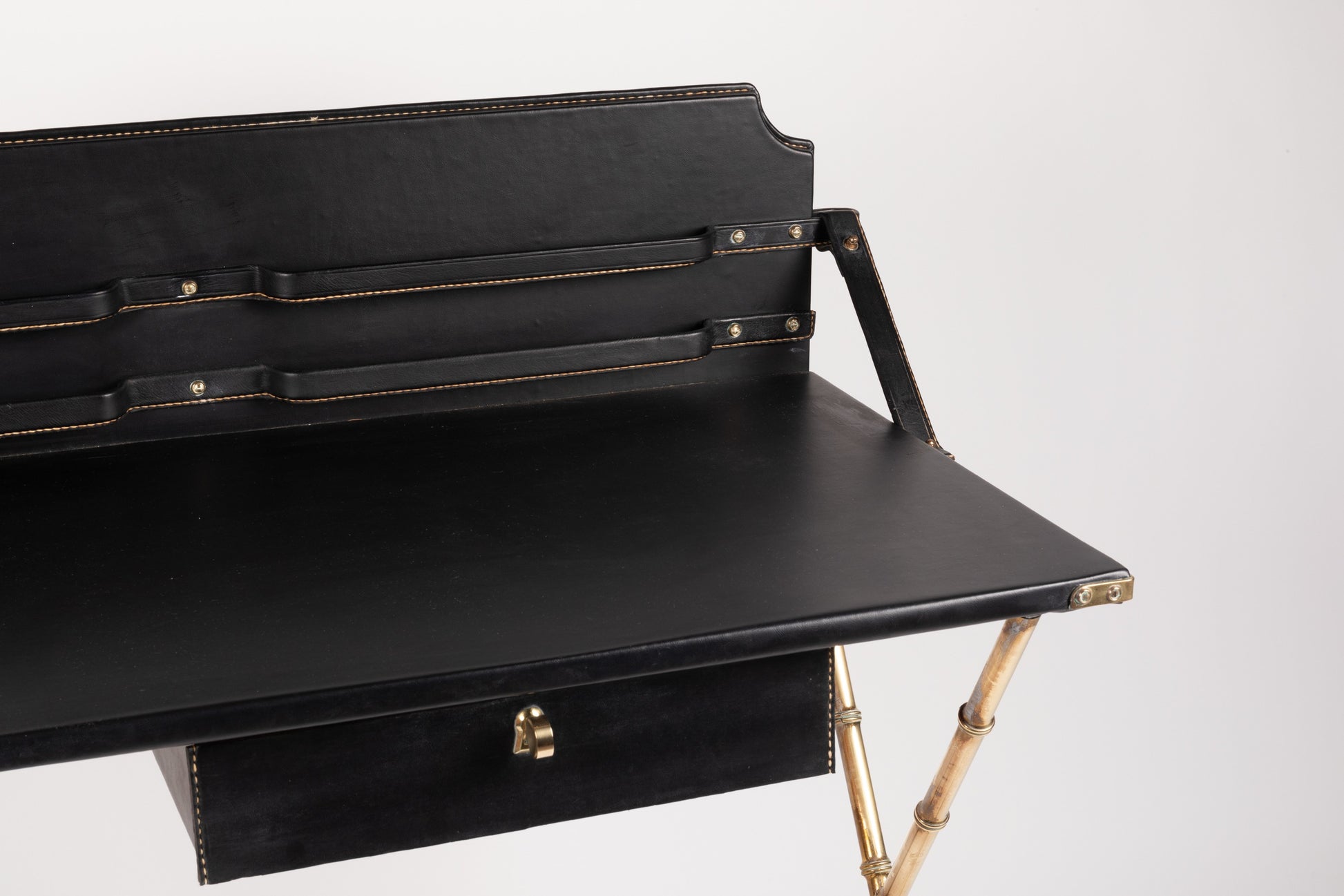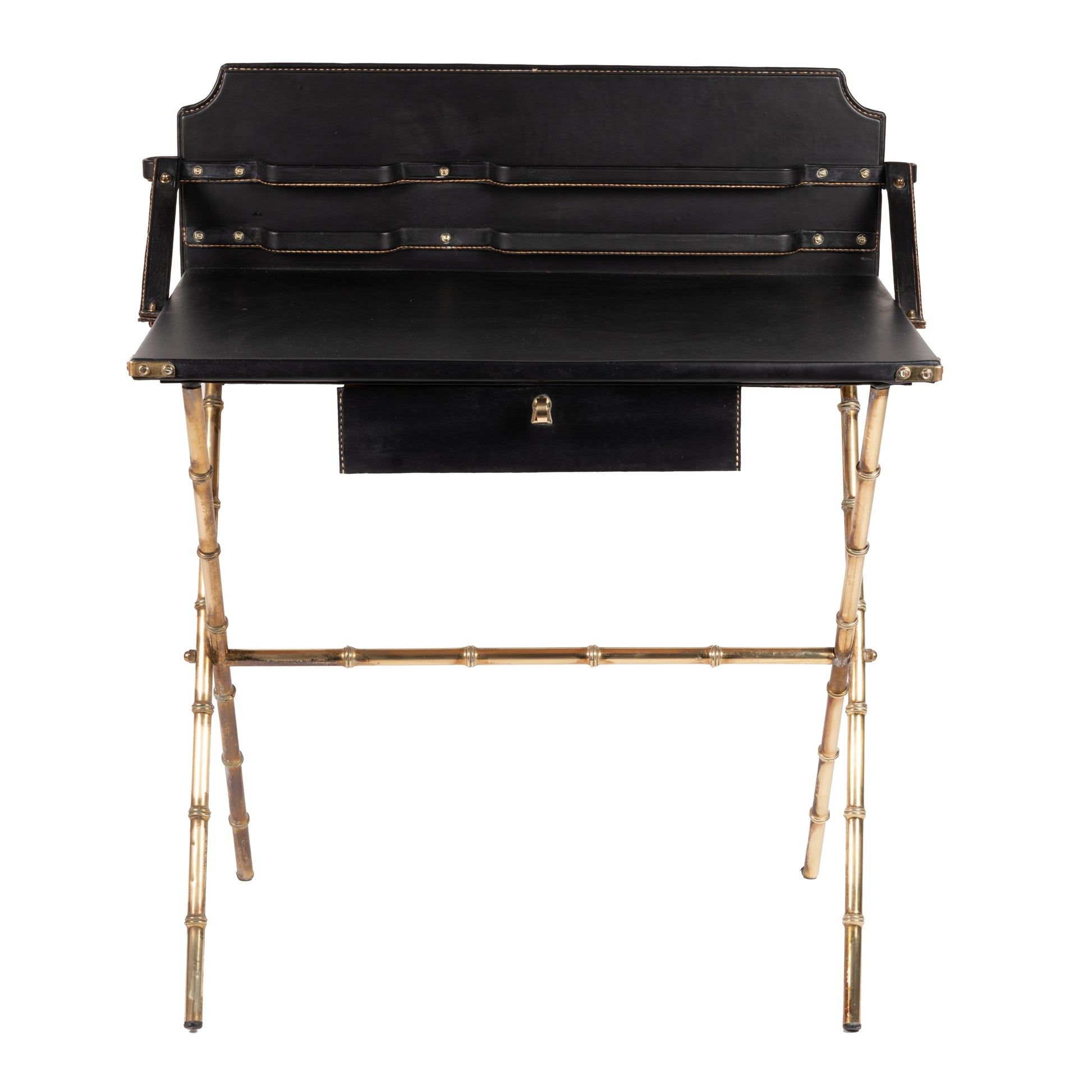 Bureau avec porte courrier gainé de skaï noir piqué sellier, ouvrant par un tiroir en ceinture reposant sur un piètement en x de style bambou en laiton doré. Circa 1950.